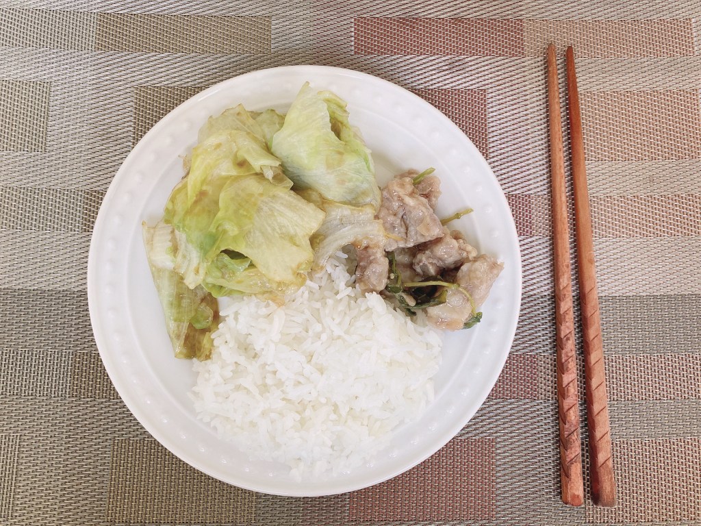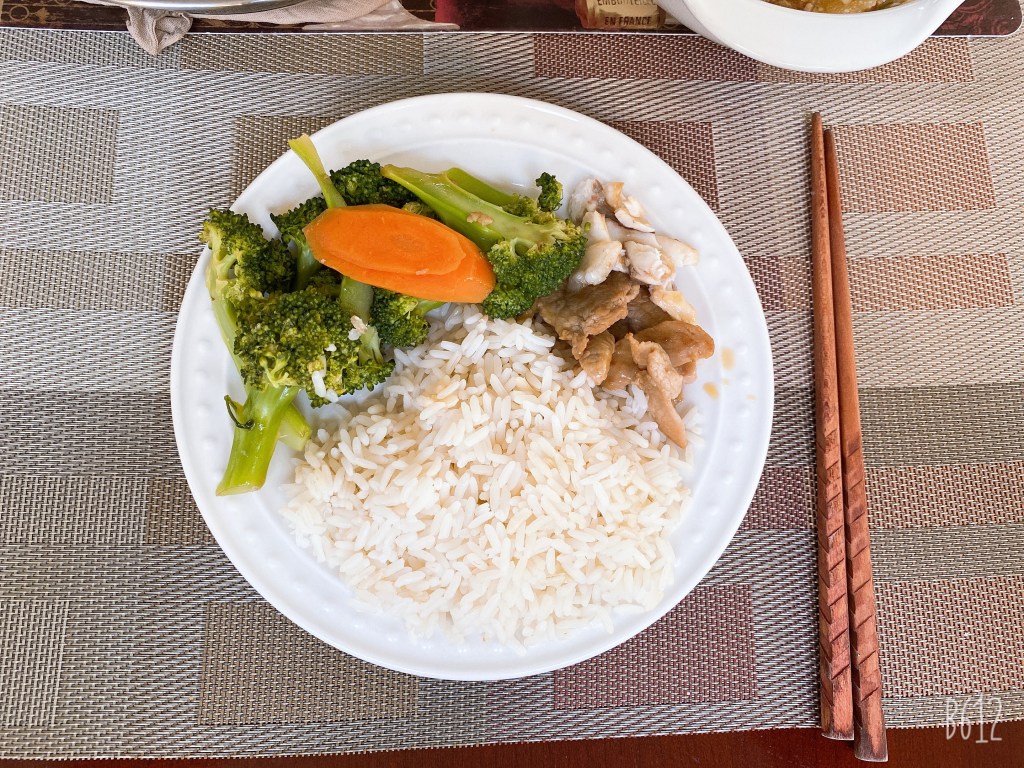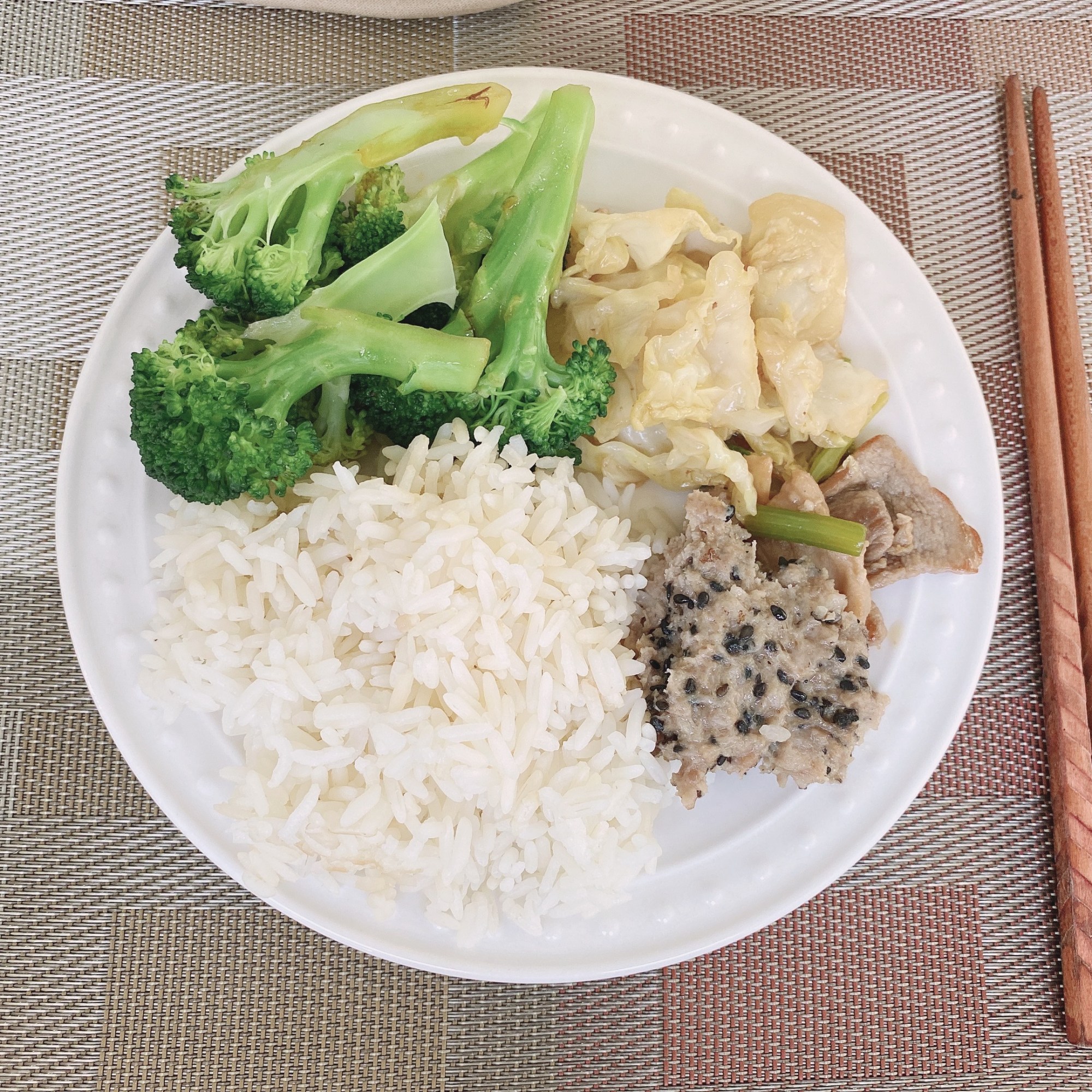 Brown rice 25%, pork pie 15%, fried Broccoli and cabbage 35%, plus 1 liter of water with chia seed and a small plate of cherry tomato( we planted these cherry tomatoes in our backyard).