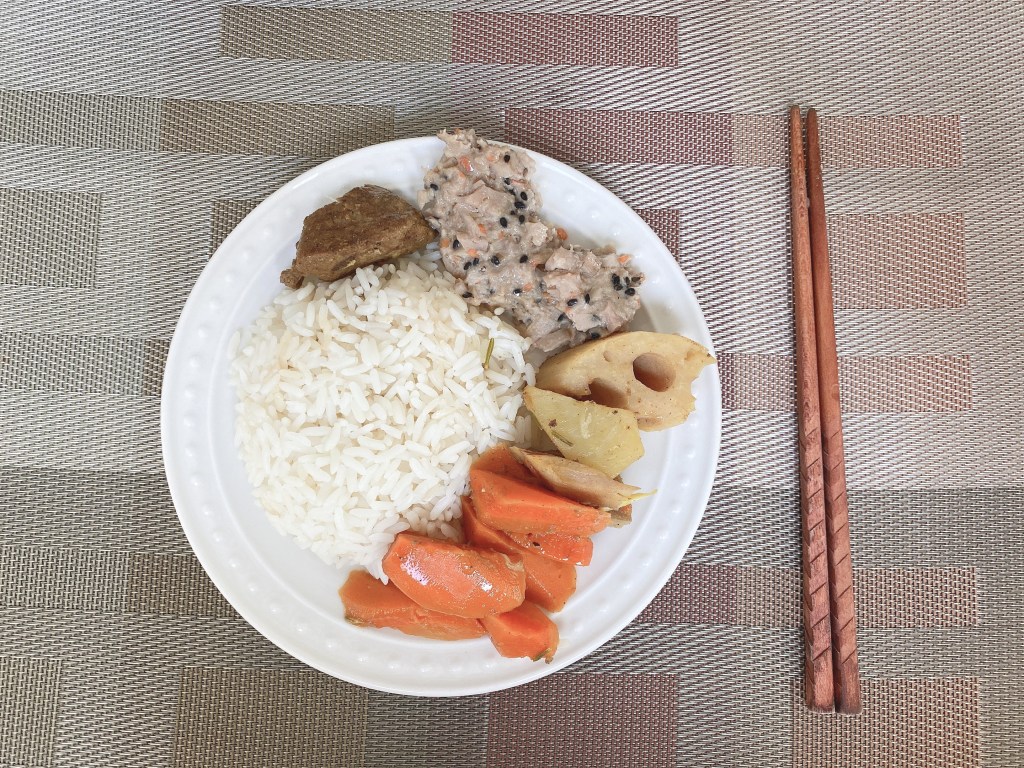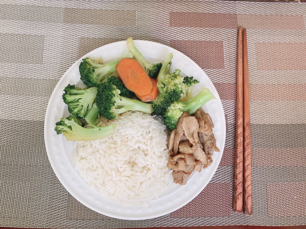 Brown rice 25%, fried pork and steamed fish with soy sauce 15%, fried broccoli, and carrots 35%, plus 1 liter of water.