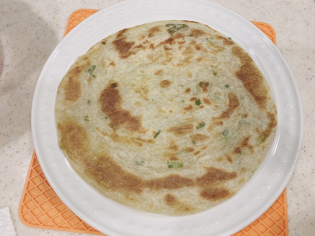 Scallion pancake ( a small plate), sugar-free coffee (a small glass), 2 pieces of crackers.