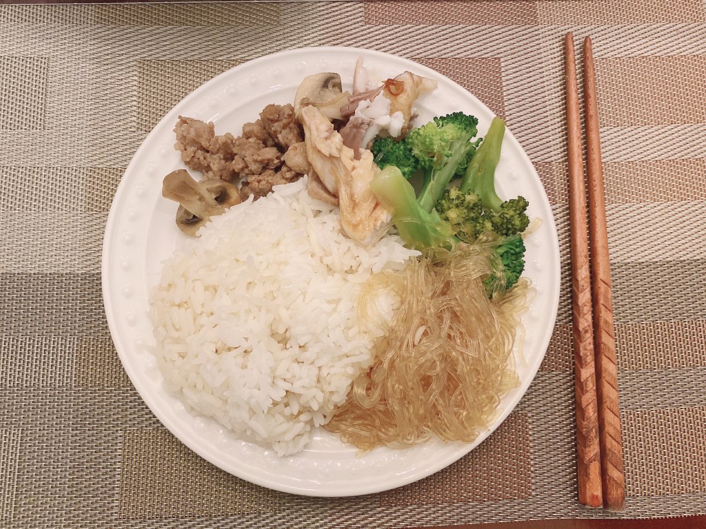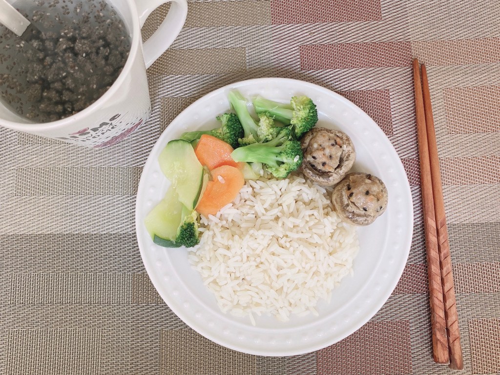 Rice 25%, sauté garlic broccoli and cucumbers 35%, fried mushroom with mince pork 15%, plus 2 glasses of water with chia seeds.