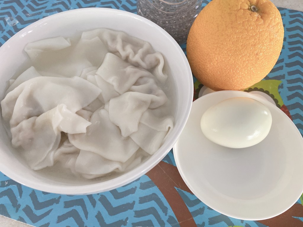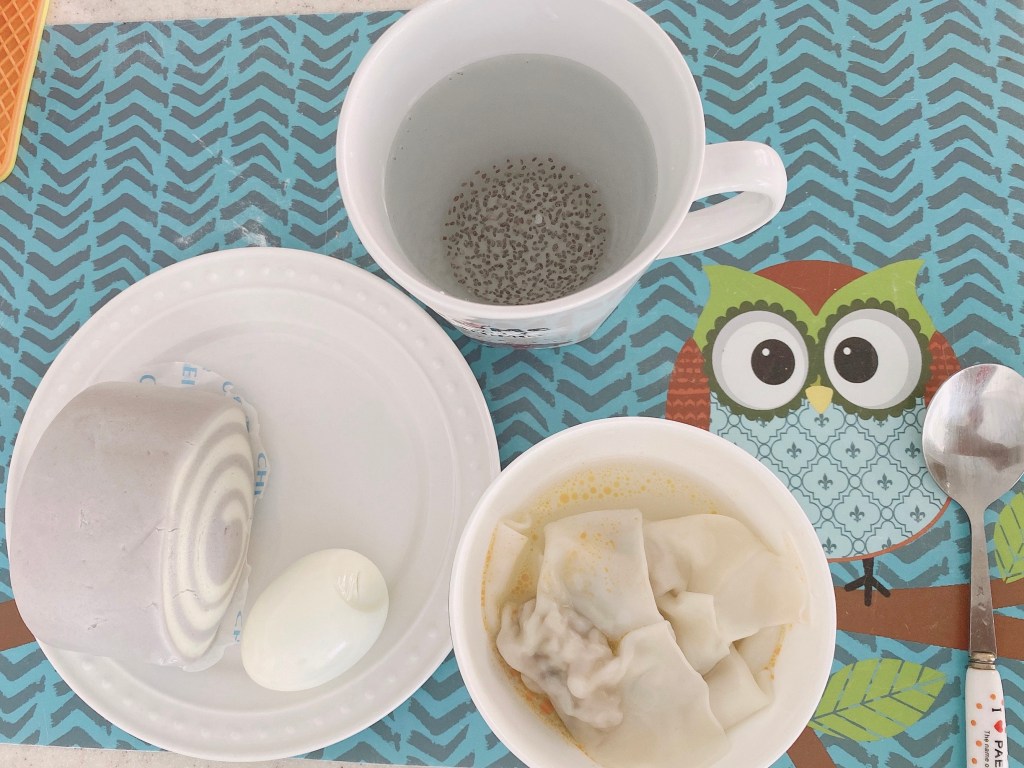 A taro bun ( I ate half of the taro bun), a boiled egg, three boiled dumplings ( a small bowl), plus a glass of water with chia seeds.