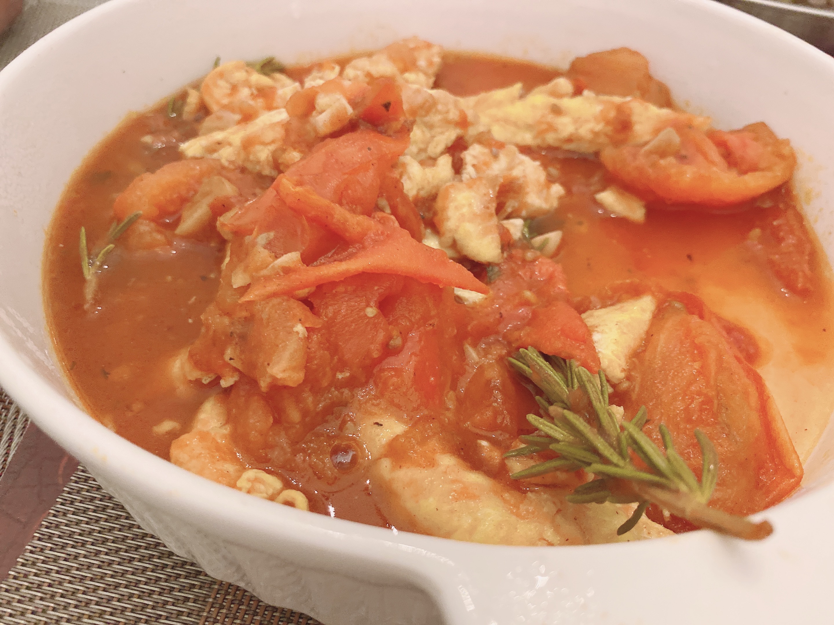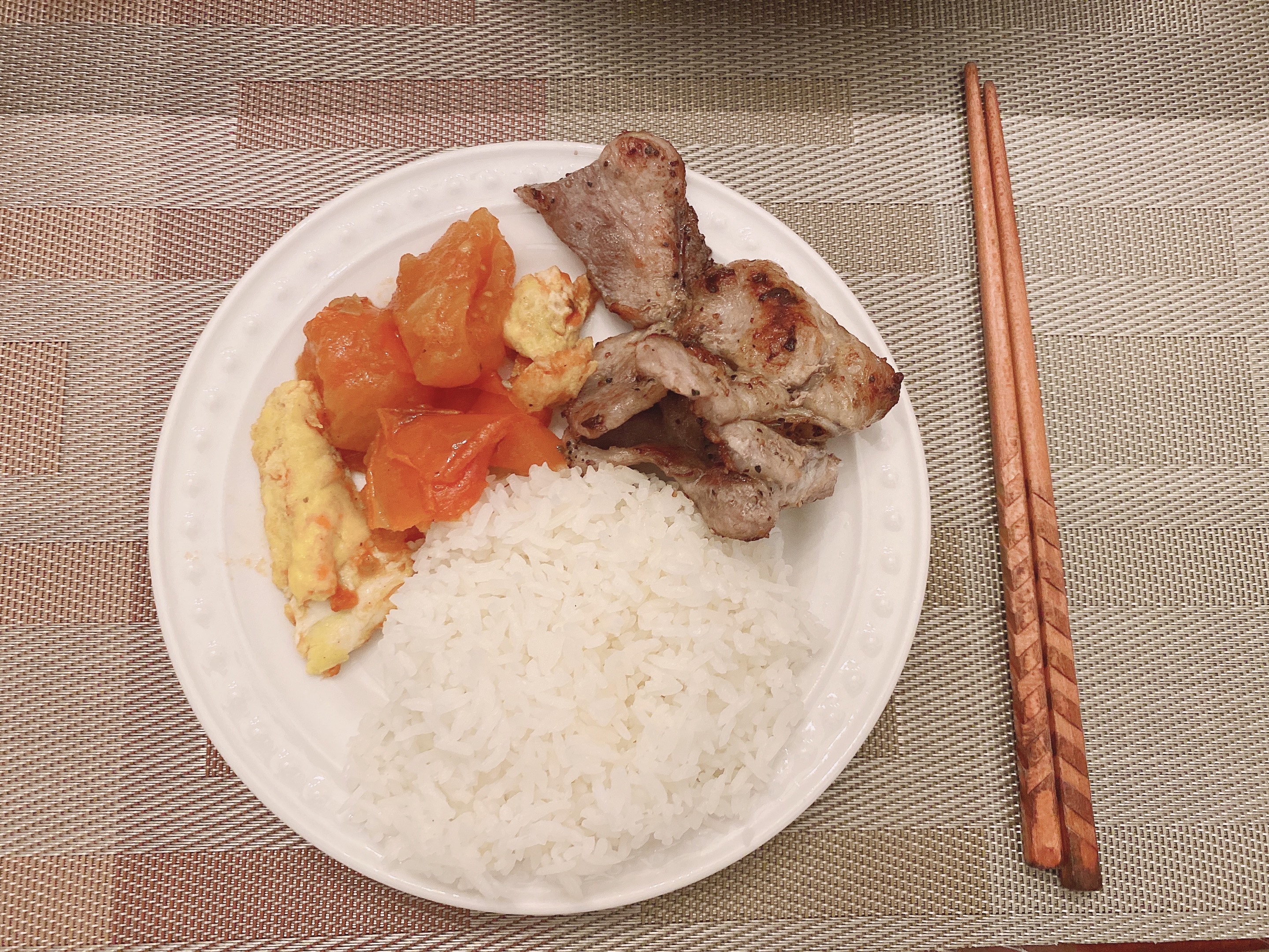 Rice 25%, fried pork chop 15%, scrambled eggs and tomatoes 35%, plus 2 liters of water.
